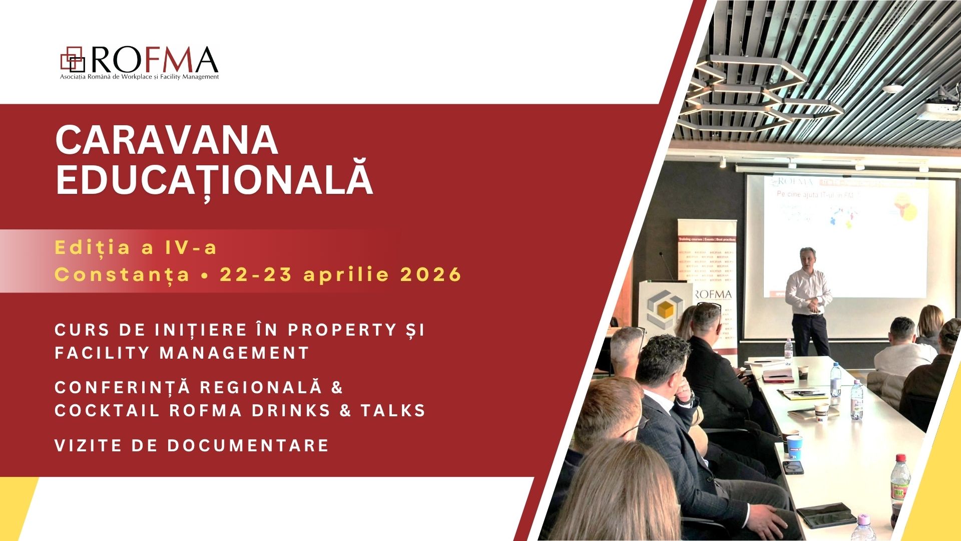 Organizat de ROFMA – Asociația Română de Workplace și Facility Management, evenimentul reunește anual lideri și profesioniști de top din ecosistemul facility, property și workplace management, inclusiv C-level management, antreprenori în real estate și facility management, proprietari de clădiri și dezvoltatori, furnizori de servicii și produse pentru spațiile de lucru, property și facility manageri, consultanți specializați, arhitecți și designeri de interior, operatori de spații flexibile, specialiști HR și reprezentanți ai mediului academic pentru a explora tendințele care modelează viitorul administrării, operării și mentenanței sustenabile a clădirilor, oferind o platformă unică de networking, know-how și inovație pentru întreaga industrie.