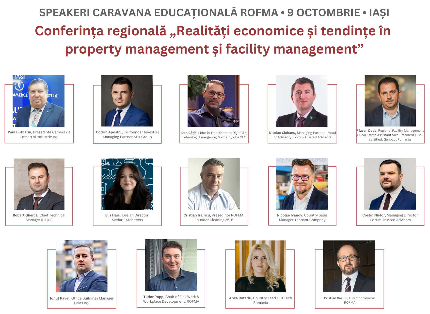 Pe parcursul unor discuții deschise și într-un climat de dialog, speakerii invitați la Conferința Regională ROFMA Realități economice și tendințe în property management și facility management – experți, profesioniști cu experiență consistentă, top manageri și antreprenori activi atât la nivel local cât și național – vor prezenta și vor dezbate împreună cu toți participanții cele mai relevante aspecte ale property și facility managementului la nivel național și regional, evidențiind oportunitățile și provocările, direcțiile de dezvoltare și tendințele specifice.
