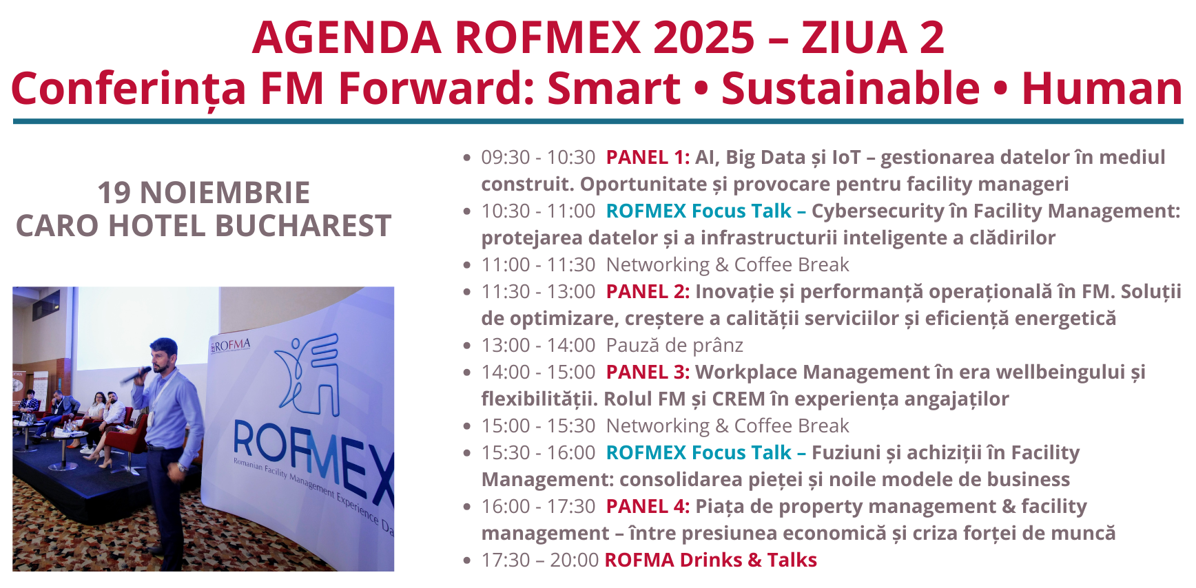 A VII-a ediție a Conferinței ROFMEX se desfășoară sub sloganul FM Forward>>> Smart • Sustainable • Human și aduce în prim-plan teme esențiale pentru industrie: