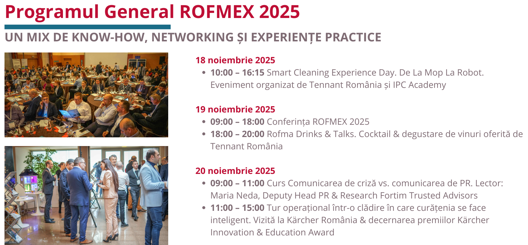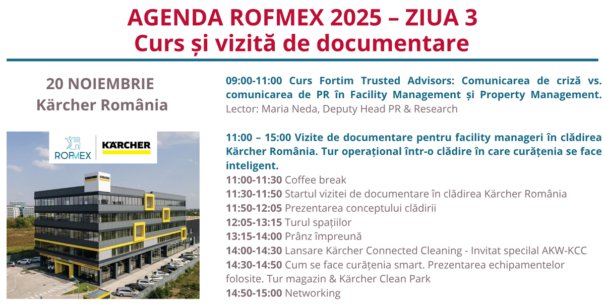 Evenimentele din cea de-a 3-a zi a ROFMEX 2025 vor avea loc în clădirea Kärcher România, Bld. Pipera nr. 2-XI, Voluntari, jud. Ilfov.